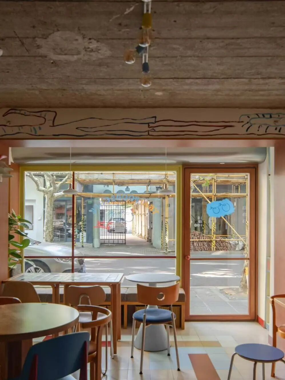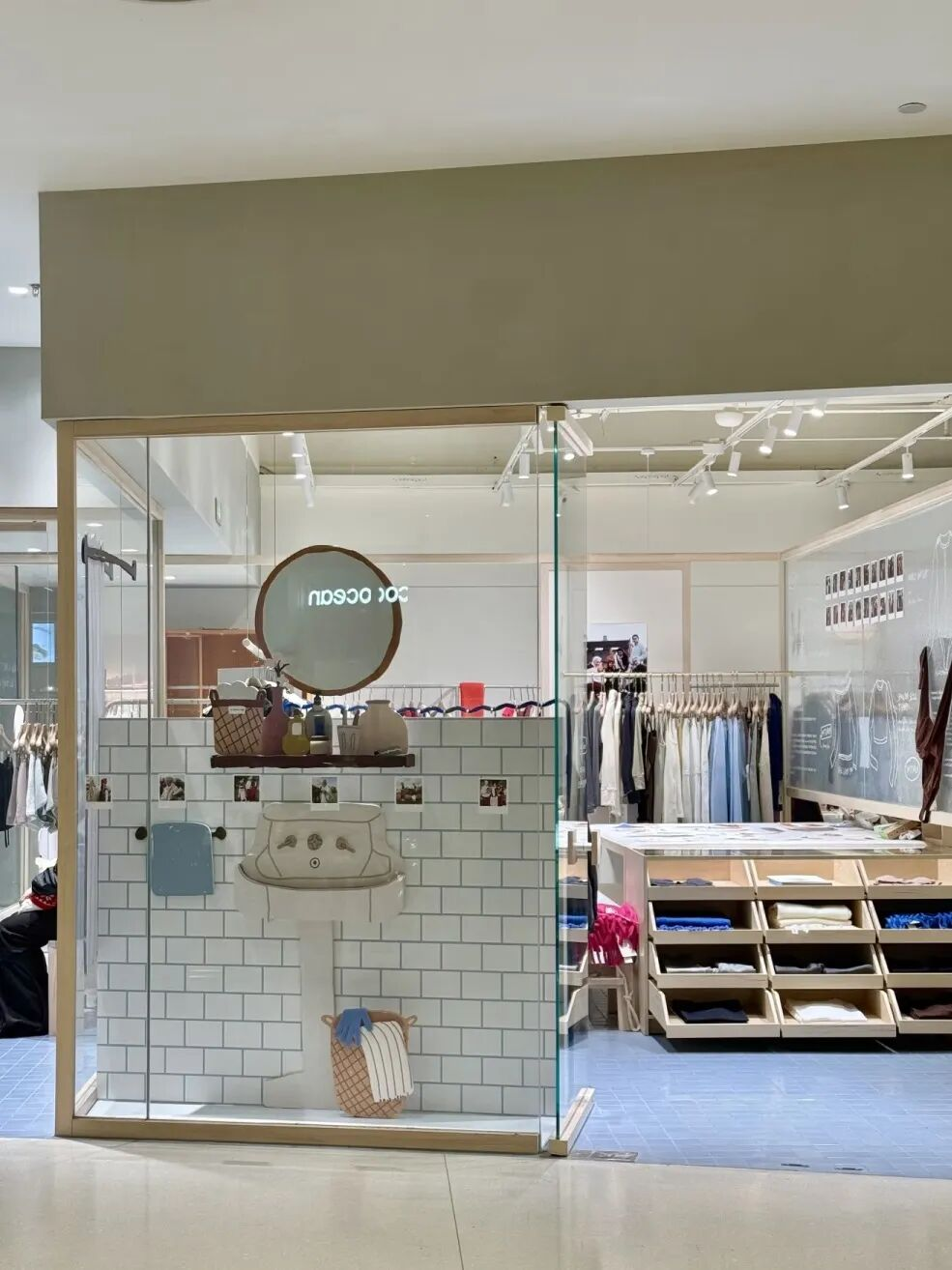 杭州店,橱窗用涂鸦式线条做成浴室主题的动画感画面,很生活化;店内能看到剪纸感doodle、小插画、手绘线条,被分散放在玻璃、墙面和局部区域里。