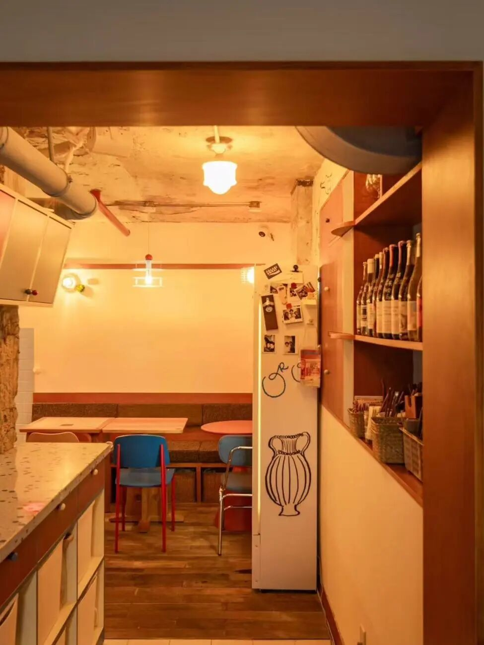 第一是半开放式厨房或吧台式操作台。你可以看着咖啡师拉花、甜品师摆盘、厨师煎牛排,强调“手作温度”与“透明化”。在鸟鸟热炒这家定位“川菜爆炒·社区食堂”的店里,风格转向市井烟火气与复古港风——红砖墙、霓虹灯、老式桌椅,开放式厨房里明火大灶火光四溅,滋啦声和香味直接弥漫到用餐区。