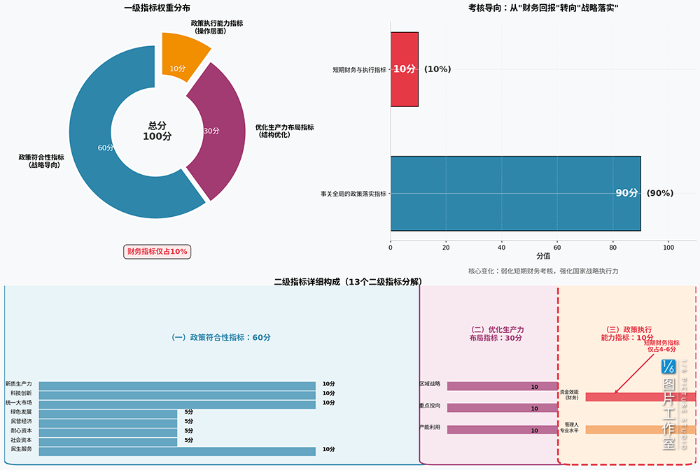 在新的评价指标中,「政策符合性」和「战略目标达成」的权重被提升至90%,而过去被视为核心指标的短期财务回报、营收平衡等,仅占10%。