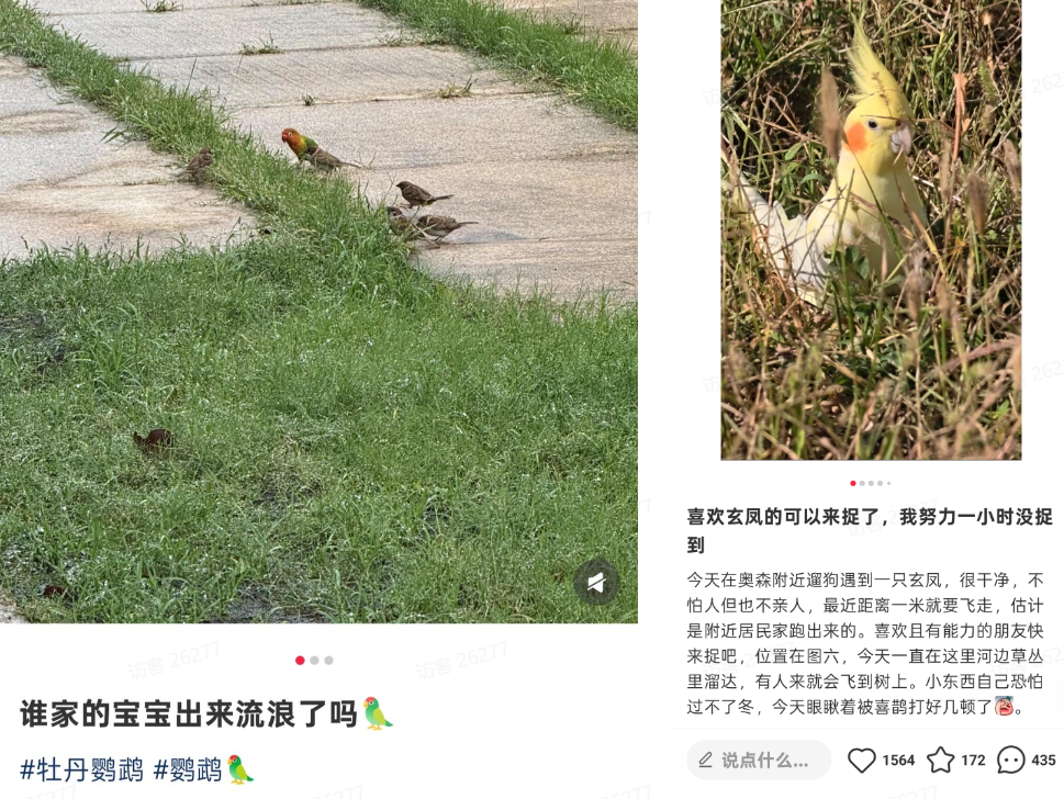 “丢鸟危机”也正在制造大量奇遇,这些羽毛鲜艳的小家伙正频繁地出现别人家的阳台晾衣架上,路边的灌木丛里,或茫然地站在鱼塘旁。