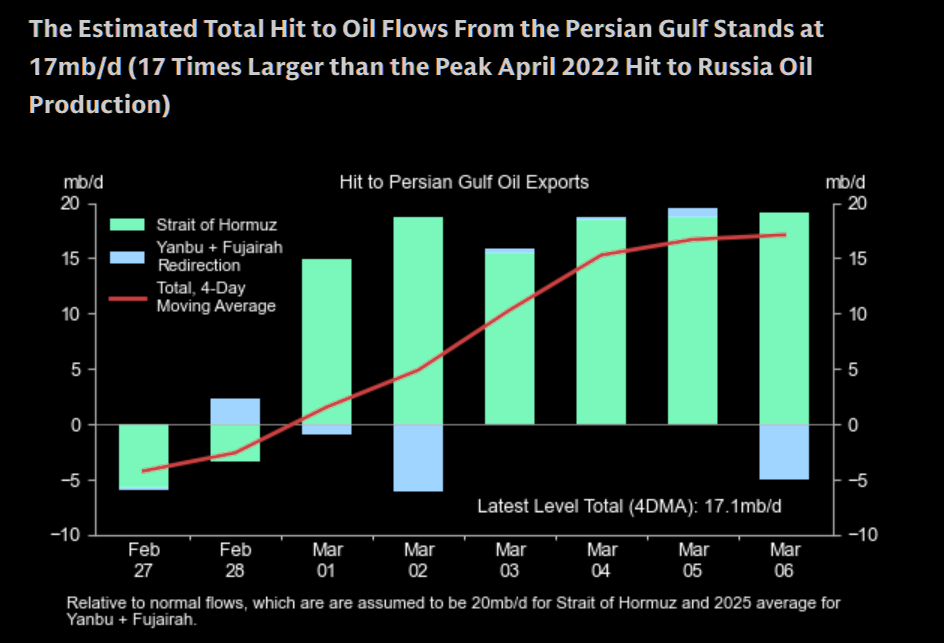 而海峡运输中断的直接影响,甚至要更大。根据高盛的统计,当前波斯湾石油出口已减少了1710万桶/日,这一数字几乎是2022年4月俄乌冲突后俄罗斯石油产量较峰值下降幅度的17倍。