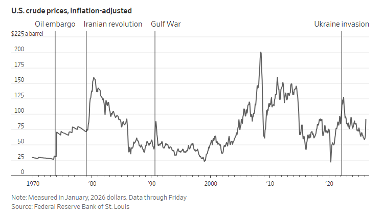目前,中东的产量约占全球产量的三分之一,与20世纪70年代初大致持平。而就产量受困的程度而言,至少在霍尔木兹海峡恢复通行前,其严重程度甚至要更甚于这三次上世纪的石油危机。当然,如今的石油市场更加灵活,长期合同较少,交易员能够更好地将货物推向最需要的买家,这是油价上周涨幅看起来还相对“温和”的原因。