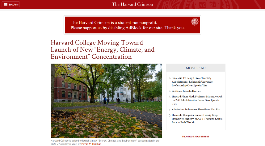 2月11日,《哈佛深红报》报道,哈佛学院正式推进全新跨学科专业「能源、气候与环境」(ENCE),已通过教育政策委员会审议,预计2026-27学年正式招生。