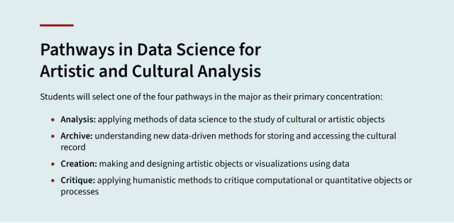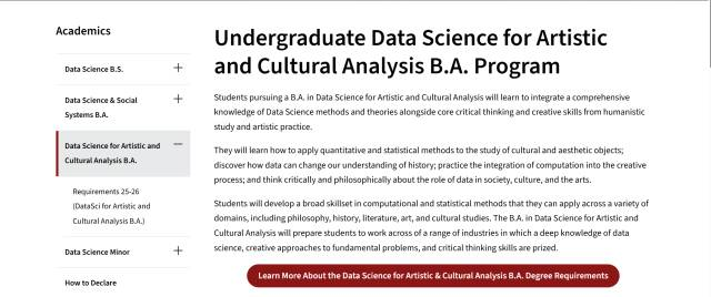 第一个叫「数据科学与艺术文化分析」(Data Science for Artistic and Cultural Analysis),挂在数据科学学士学位下,专门为热爱人文艺术、同时想掌握数据技能的学生设计。