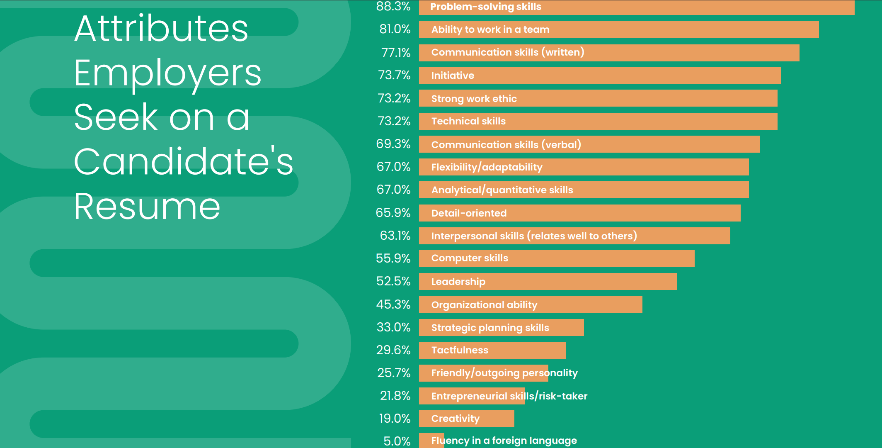 美国全国大学与雇主协会(NACE)在2025年发布的《就业展望》显示:近90%的招聘人员在简历上最优先寻找的,是解决问题的能力;超过80%看重团队协作;超过75%看重沟通能力。