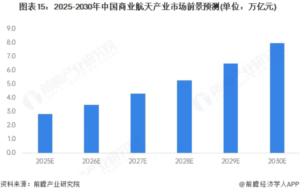 2025—2030年,中国商业航天产业将进入发展黄金期,预计2030年中国市场规模将达到8万亿元。