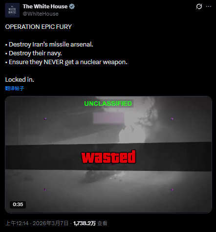 除此之外,你也能看到近两年来,白宫经常利用电子游戏来宣传其军事动作:上周,官方X账号发布了将《使命召唤》画面剪进对伊朗军事行动的视频,而在这两天,他们又发布了一段空袭伊朗与GTA混剪的视频。
