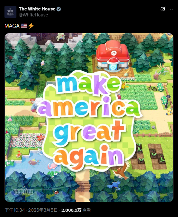 3月5日当天,白宫的官方X账号发布了一张相关图片,将《宝可梦Pokopia》主视觉图的游戏标题,换成了特朗普的政治口号“Make America Great Again”。