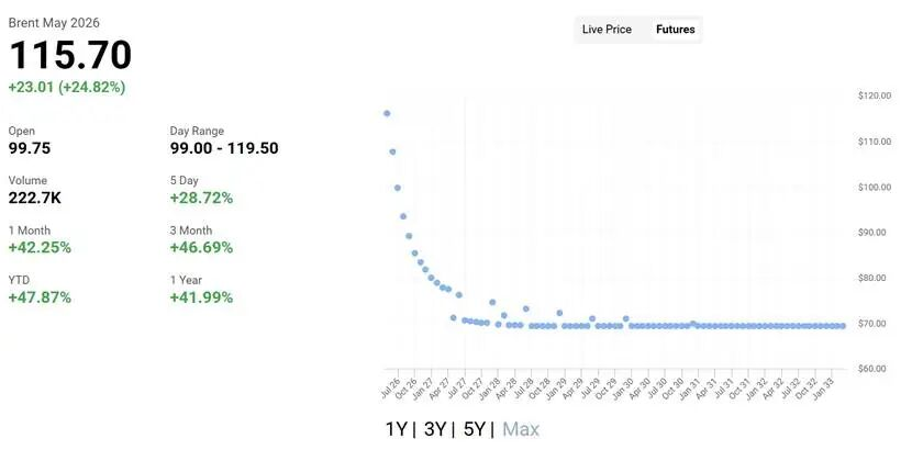 这一完整backwardation结构(近月远高于远月)清晰表明:市场已将霍尔木兹扰动定价为“短期事件”,而非持久供给危机。