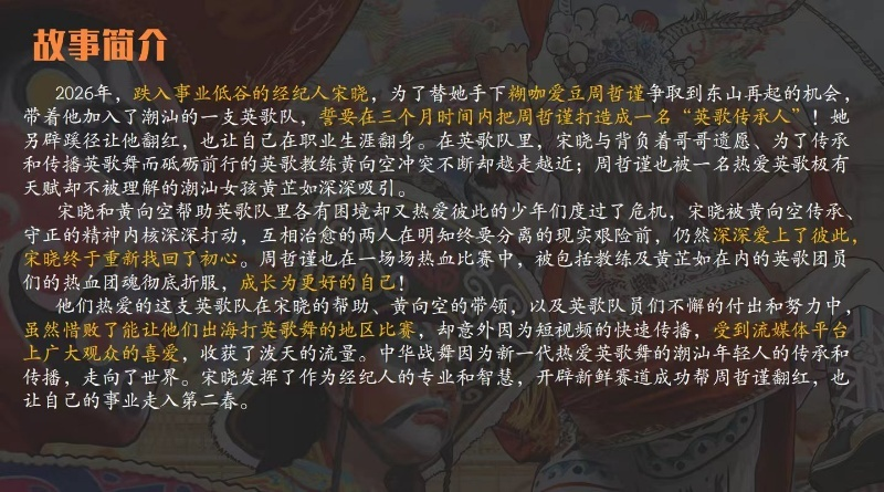 它首部聚焦国家级非遗“潮汕英歌舞”的创新题材剧集,讲述了跌入事业低谷的经纪人宋晓,带着她手下的糊咖爱豆周哲谨,加入了潮汕的一支英歌队后发生的故事。