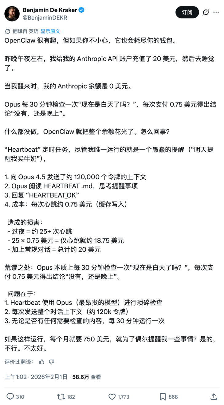 有开发者复盘后发现,系统在没有太多实际产出的状态下,仅靠该机制维持每天就消耗20美元,一个月白白用掉近750美元。