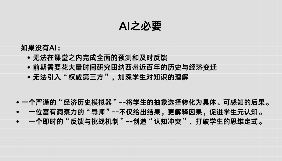 在给老师们分享这堂课的时候,我着重强调了这堂课的「AI之必要性」,如果没有AI,这堂课是无法落地的,因为我的知识储备无法在短时间内对学生做出的选择进行模拟和反馈。