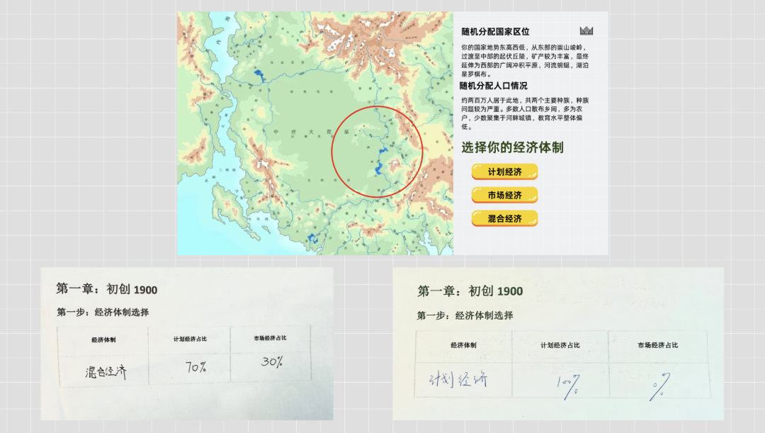 我给学生提供了一张虚拟地图,和一段时间背景为1900年的「虚构」人口说明,让他们分组扮演领导者,根据所给条件选择该虚拟国家的经济体制与重点产业。