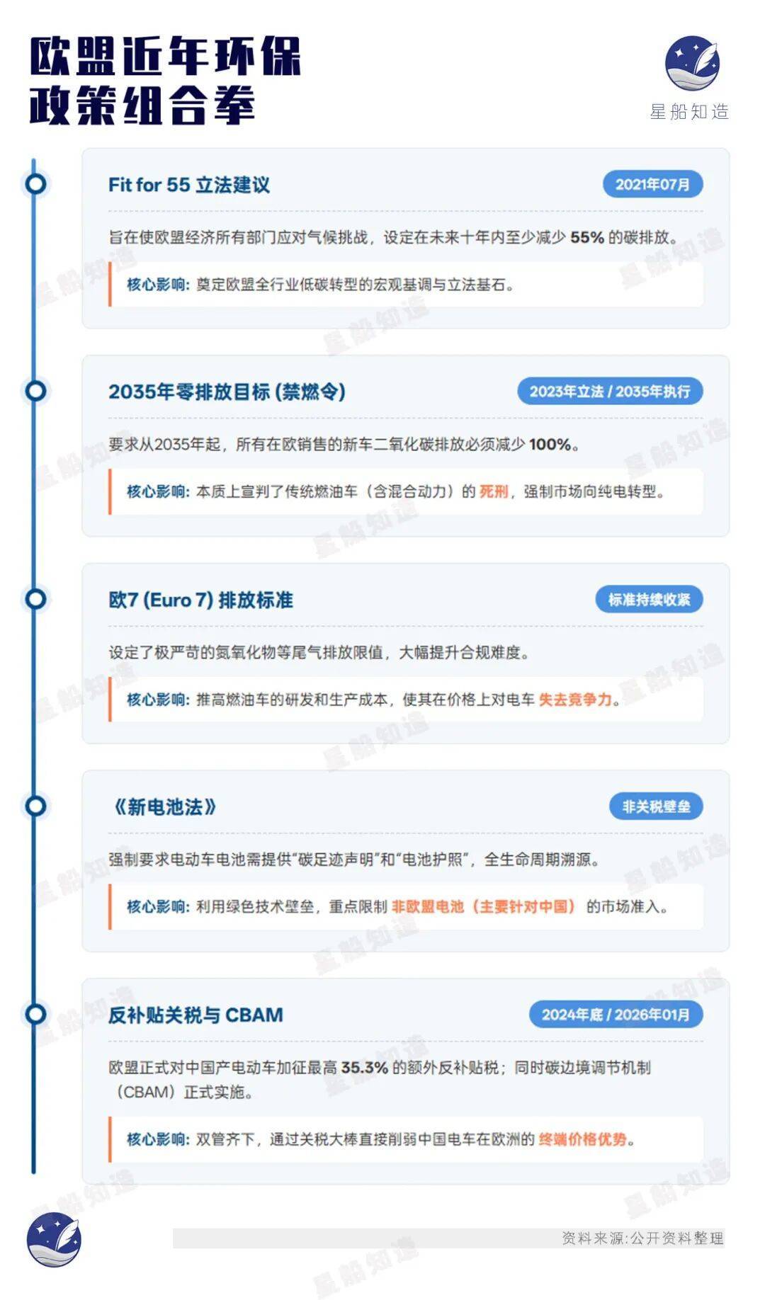 在此思路上,欧盟激进地推出一连串政策组合拳。《星船知造》大致统计如下: