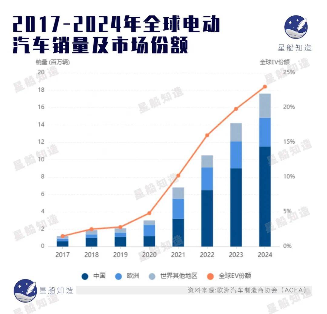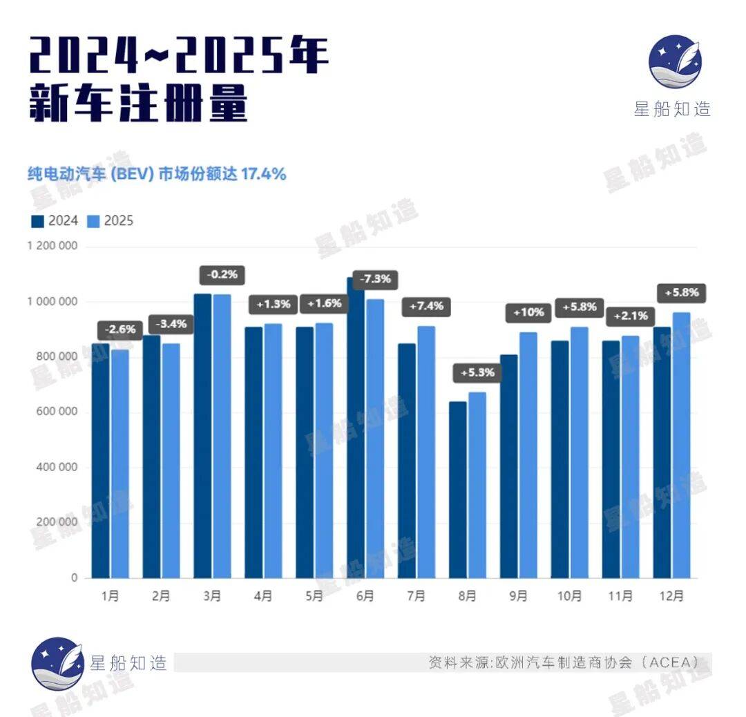 《星船知造》在欧洲汽车制造商协会(ACEA)最新统计看到,尽管有一系列政策强推,但2025年全年欧洲新车注册中,纯电动车(BEV)的市场份额仅维持在17.4%,远未达到欧盟激进路线图所设想的“爆发点”。