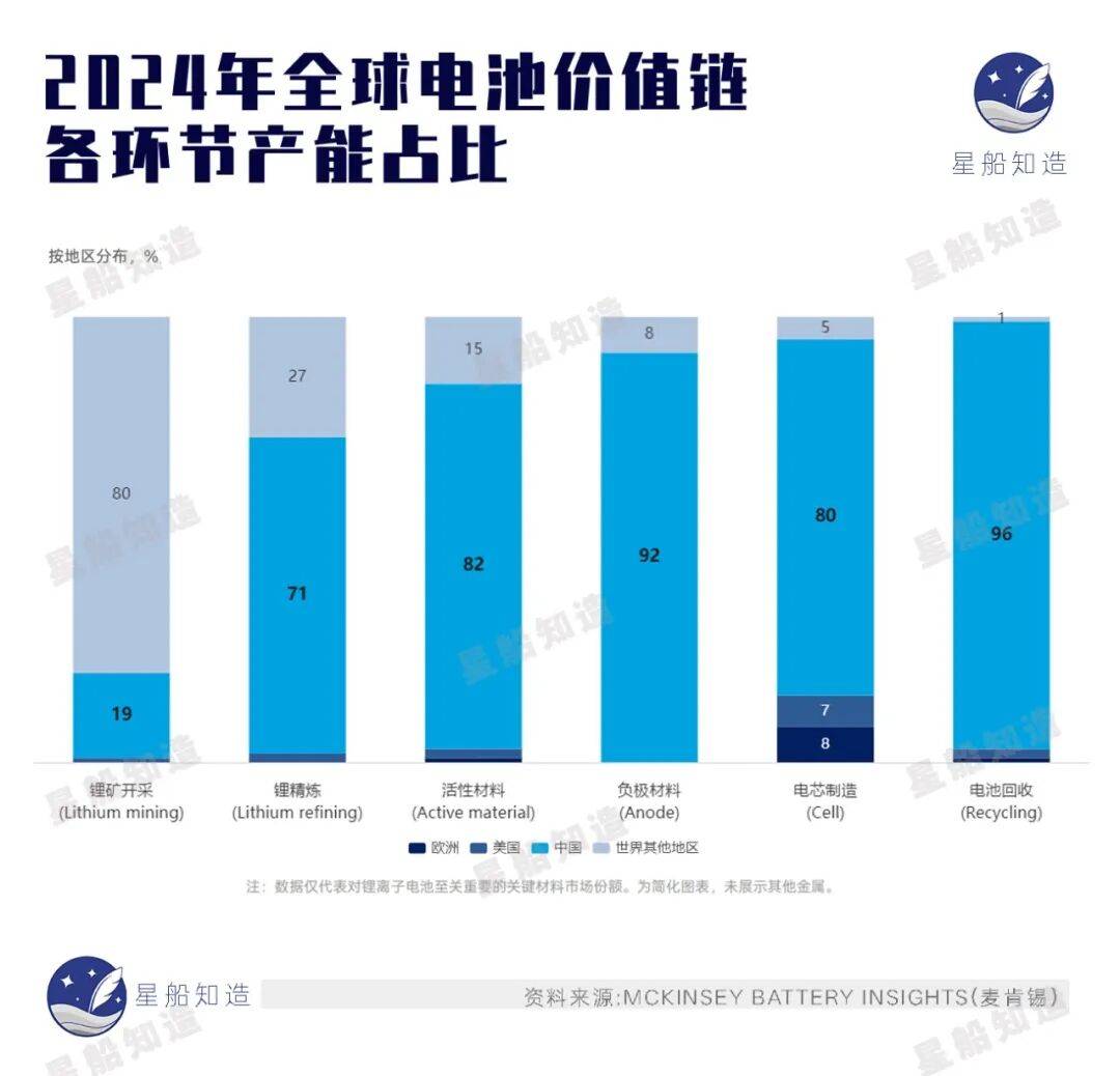 从下图可以看到,与欧洲和美国相比,中国在全球电池产业链上游生产环节(如锂开采、精炼、正负极材料等)占据了显著份额。