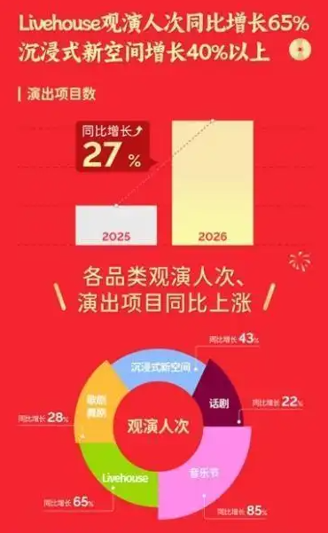 根据大麦的数据,光是今年春节,Livehouse观演人次同比增长65%,沉浸式新空间等新兴形态观演人次同比增长超40%。