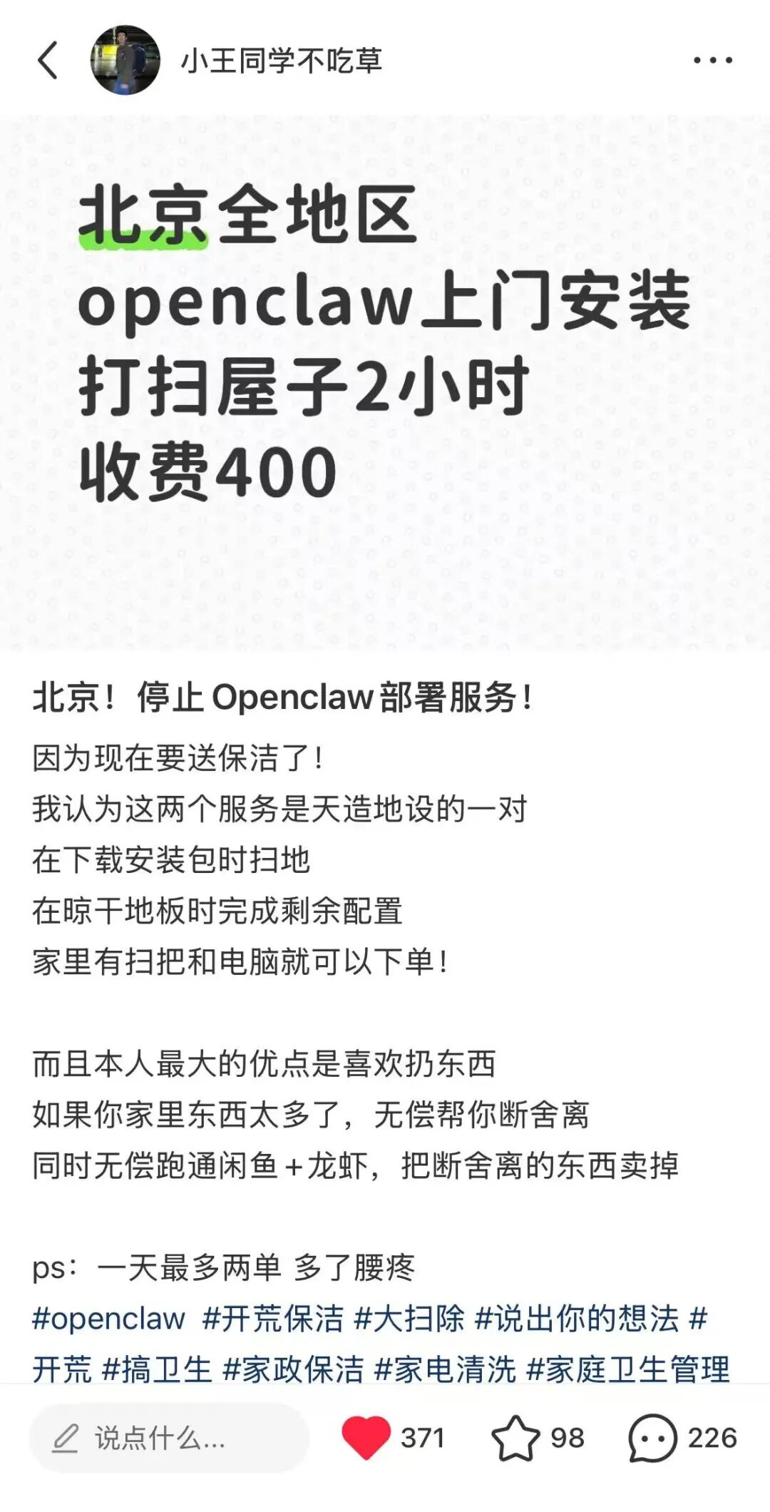 我这人一直很爱折腾,越猎奇越麻烦的东西我越有兴趣。本着反正躺平在家不动白不动的原则,3月2日凌晨,我在小红书上架了一个极其荒诞的服务:保洁+OpenClaw代部署。
