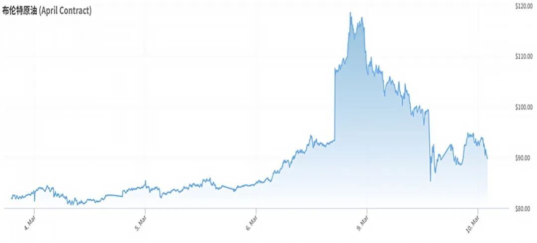 另一大变化是金融市场:3月9日,国际油价突然飙升。当天盘中,布伦特原油一度冲到每桶119.5美元,创下2022年以来的新高。
