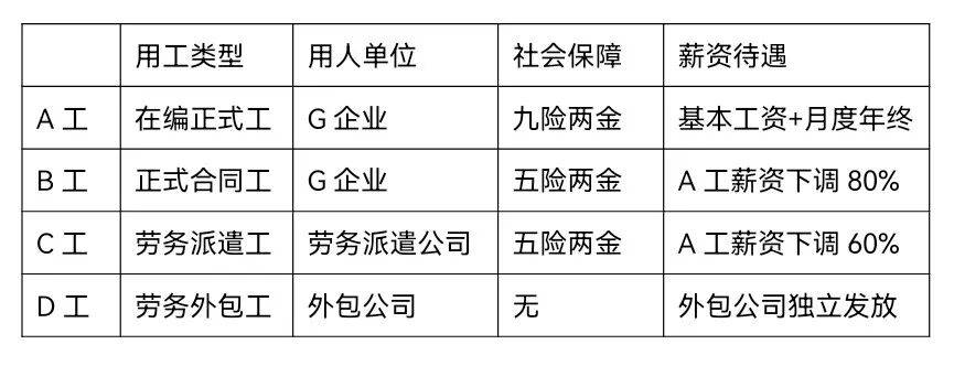 目前,企业G向社会公开招聘的岗位,基本只能享受B工的社会保障及薪资待遇,A工正随着时间的推移逐步自然减少。据员工M所说,目前企业G已经将现存的A工视为某种历史遗留产物,想裁裁不掉,想降薪降不了。对于G而言,A工不仅握有终身制的雇佣身份,且其工资、福利、社保、公积金、企业年金等各项补贴一应俱全,他们越多,企业G的用工灵活程度越低,用工成本越大。但直接辞退他们,企业G所面临法律风险与舆论风险同样不可小觑,故而自然减员成了企业G最安全也最无可争议的用工优化路径。