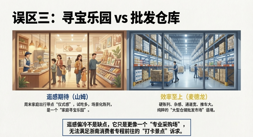 麦德龙在浙南面临“身份认同”问题,其专业B端基因与大众消费期待错位,导致体验不及山姆的网红感,但强化专业定位仍有机会突围。 ## 1. 会员模式与消费心理的错位 - 山姆260元年费抬升用户对“品质打卡”的预期,而麦德龙“0元入场+PLUS折扣”削弱了会员店的高端心智,消费者难将其视为“必选”。 - 关键对比:免费门槛导致麦德龙被误读为“普通超市”,而非山姆式的“生活方式目的地”。 ## 2. 商品定位的认知偏差 - 山姆通过Member’s Mark强化“品质确定性”,麦德龙“麦臻选”和“宜客”两条产品线(高端+平价)却因民生货占比高,被视作“物美升级版”。 - 核心矛盾:专业采购底子(如餐饮供应链)与浙南中产对“网红爆款”的需求不匹配,消费者更渴望“打卡价值”而非“批发实惠”。 ## 3. 仓储体验的冷感困境 - 麦德龙宽通道、大推车、冷光陈列效率优先,但浙南消费者期待“家庭寻宝乐园”的仪式感,其“批发仓库”风格弱化了吸引力。 - 关键结论:实用性与体验感失衡,需在“专业场”与“打卡点”间找到平衡。 ## 4. 突围方向:强化专业标签 - 建议麦德龙聚焦“专业厨房/食材供应商”定位,通过减法策略(如精简SKU、突出B端优势)重塑差异化认知。 - 用户行动指南:以“专业采购”而非“网红探店”心态消费,更能发现其价值。