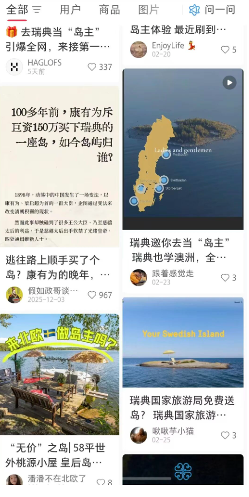 小红书上,很多网友根本还没开始研究瑞典地图,就已经做起白日梦,把自己代入了那个清晨被海风吹醒、整座北欧小岛上只有自己和鸟鸣的人。