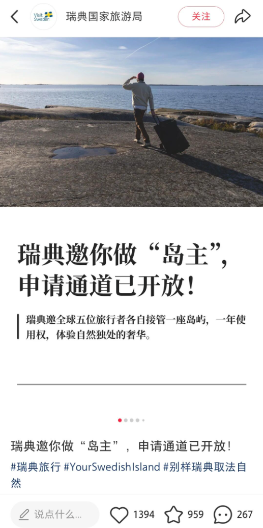 但「瑞典要免费送你一座岛当一年岛主」,若被刷到,很多人就会忍不住发给朋友,说一句「我们去试试?」
