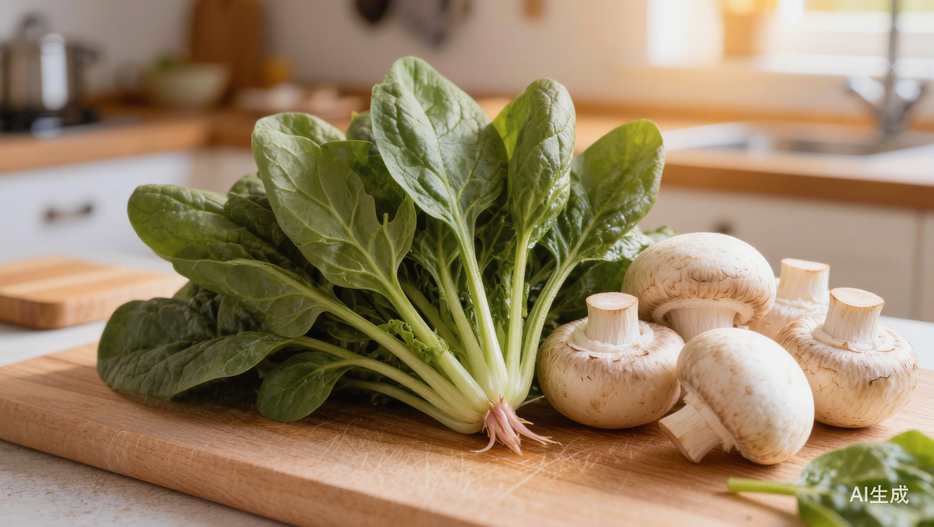 更好的办法是与菌菇共冶一炉,用菌菇的香味覆盖土腥味,这两者在化学上不是“一家人”也是亲戚。蘑菇的香气由放线菌(Actinomycetes),特别是其中的链霉菌(Streptomyces)贡献,链霉菌在分解有机物时,会产生一种名为土臭素(Geosmin)的化合物,这就是我们闻到菠菜的“土腥味”的主要来源。菌菇生长在富含有机质的土壤中,与放线菌共生。许多蘑菇(如松茸、牛肝菌等)自身的代谢产物中,也含有土臭素或类似的挥发性物质。所以,当你闻到蘑菇的“泥土气息”时,你实际上是在闻一种浓缩版、混合版的土腥味。只是菌菇的香气成分更复杂,除了土臭素外,还包含大量的萜烯类(Terpenes)化合物,萜烯类物质通常带有木质、泥土或蘑菇的气息,再加上菌菇自身的鲜味氨基酸,这种“套餐式”的复杂组合产生了一种“森林地面”或“木质”的香气,被我们的大脑解读为“鲜美”或“独特”。由于土臭素是菌菇味的“底色”,近朱者赤,菌菇味可以完成对菠菜土腥味的全覆盖。