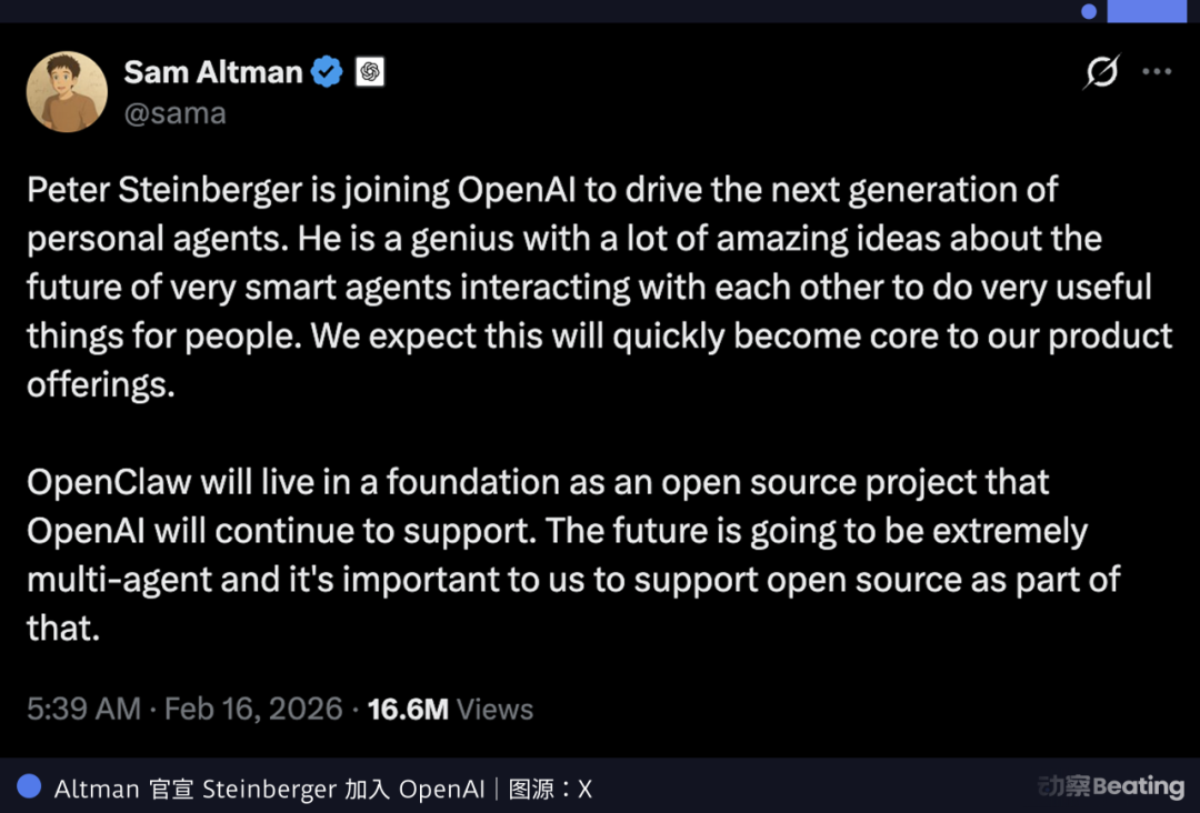 2026年2月,OpenAI雇走了Steinberger。Sam Altman在X上称他是天才,并宣布他将负责公司的下一代个人Agent。OpenClaw进入一个由OpenAI支持的独立开源基金会。