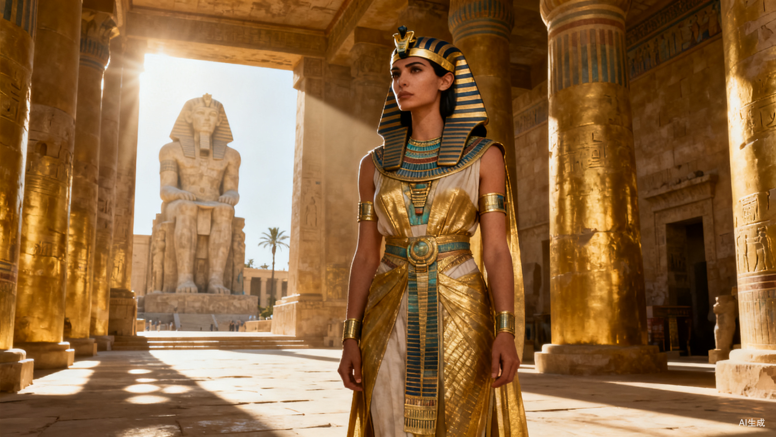 穿着古埃及贵族服饰,佩戴简单金饰,不夸张