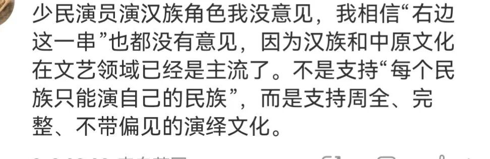 不过按他们的说法,汉族文化是主流,所以非主流的少数民族演员去演绎主流文化是应该的,倒过来则不行,这才叫“不带偏见”。
