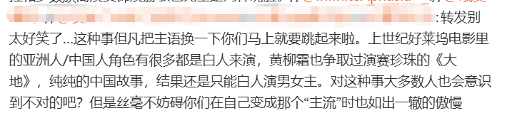有人进一步发散,甚至不惜用好莱坞当年让白人演亚洲角色的事进行类比,说这和白人排斥亚裔演员的行为是一模一样的,既不尊重角色,也暴露出属于“主流群体”的傲慢。