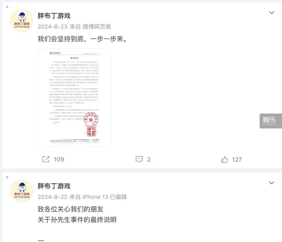 “我当时是想必须要好好说一下这个事情,公司内部也有人劝我录个视频。”棉花对触乐表示,“当初我们其实一直在那个转发最高的帖子底下留言,试图告诉玩家真相是什么。但是没用,因为他(狸子)会把评论删掉。所以那个最高赞的帖子下面,能看到的永远是他想让大家看到的东西。大家就会冲到我们的微博下面去,不管我们说什么都不相信。我们发表声明、做了公证,但大家就是不信。”