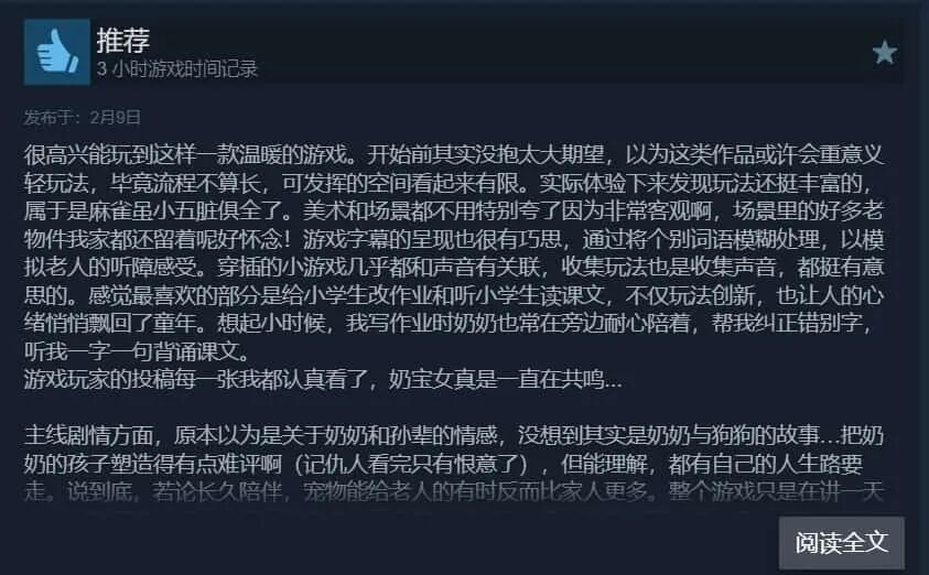 有玩家在评论区写道:“玩完游戏我立刻给奶奶打了电话。”还有人分享自己与外婆的合照,说游戏让他想起了已经离世的亲人。