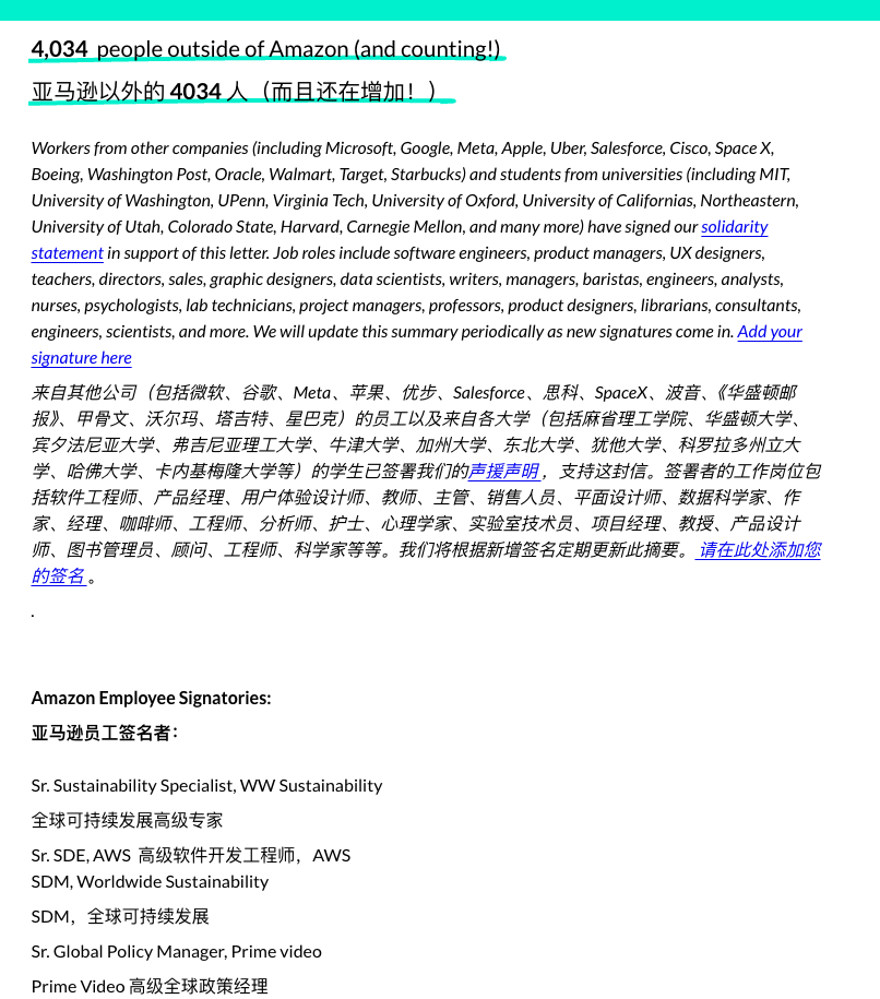 亚马逊的员工们不想坐以待毙,他们发起了联合签名行动,不仅鼓励员工们参与,也呼吁外部人士加入进来,目前已经有超过四千多人参与。