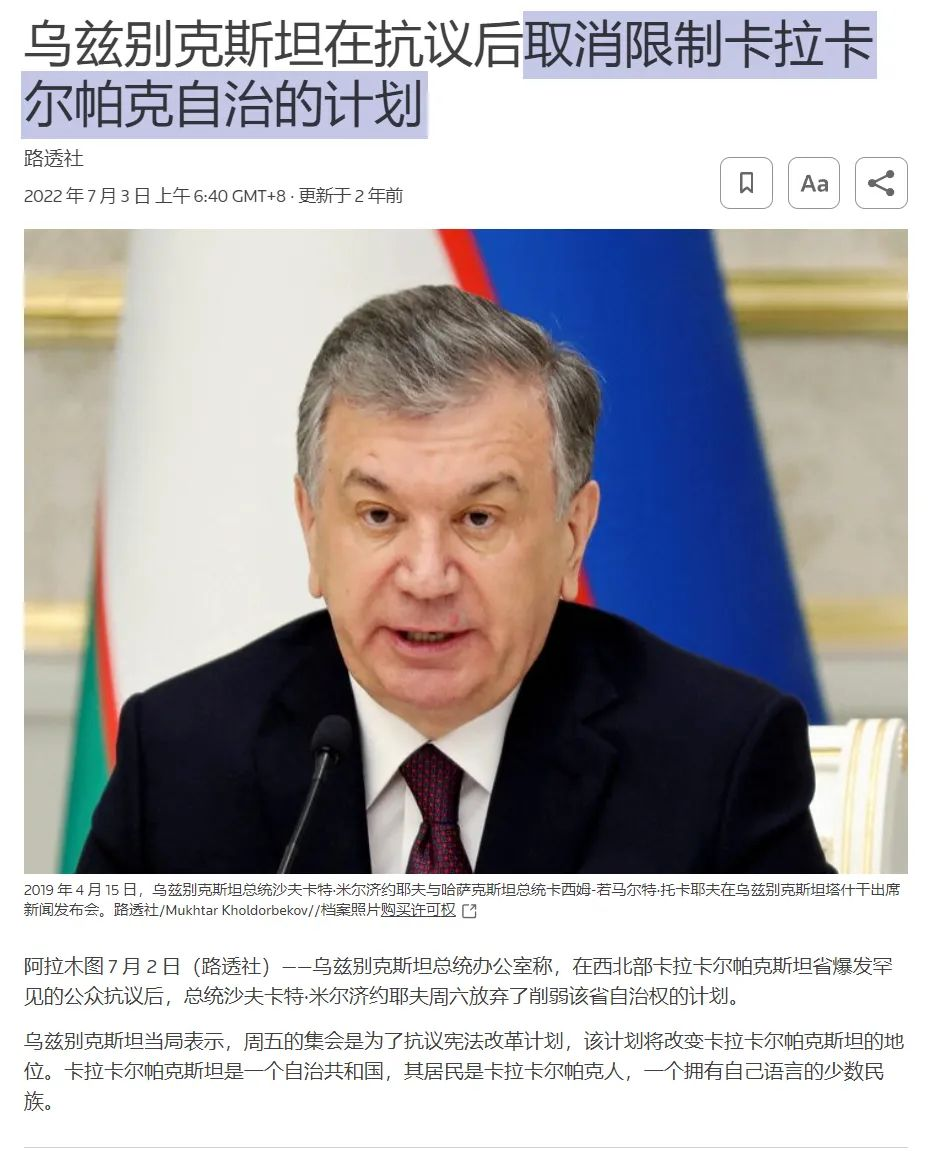 2022年,乌兹别克斯坦政府意图取消卡拉卡尔帕克斯坦的自治地位,当地立刻爆发大规模抗议。最后塔什干不得不妥协,并承诺加强咸海的生态恢复工作。