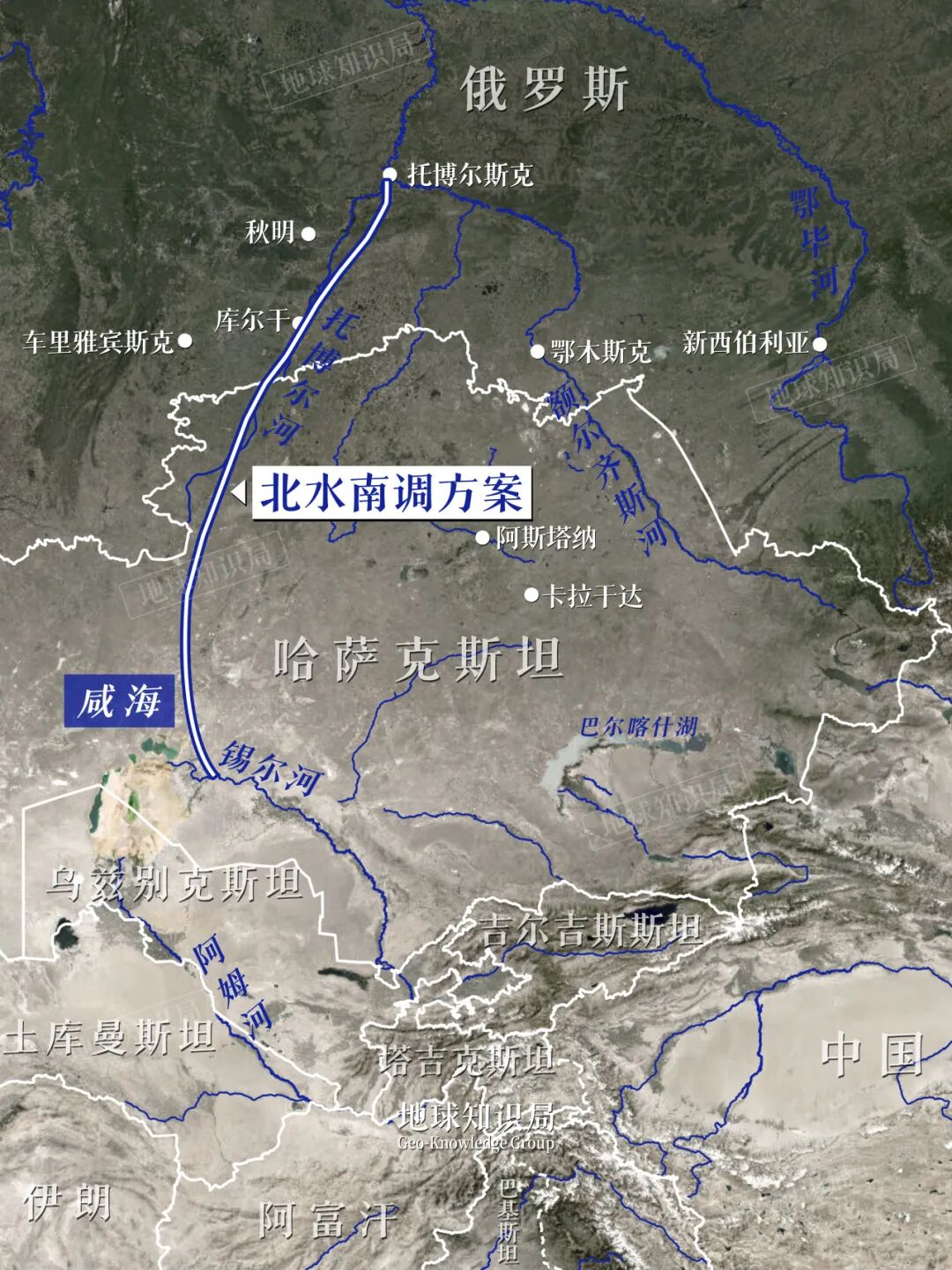 苏联专家设想过一条宏伟的调水路线:在额尔齐斯河与托博尔河交汇处修水坝使其倒流,再修一条运河五级提水翻越图尔盖分水岭,跨越上千公里注入锡尔河下游补充咸海。