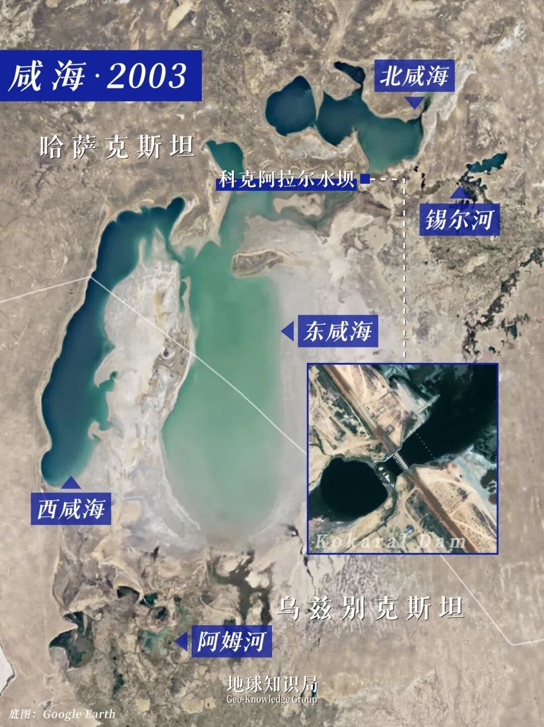 2003年,两河的补给量只剩32亿立方米了,只有1960年的5%。同年,南咸海再次东西分裂。哈萨克斯坦眼看情况不妙,赶快修了一道科克阿拉尔(Kokaral)水坝防止湖水南流。此举虽然保住了北咸海,但也加速了东咸海的干涸。
