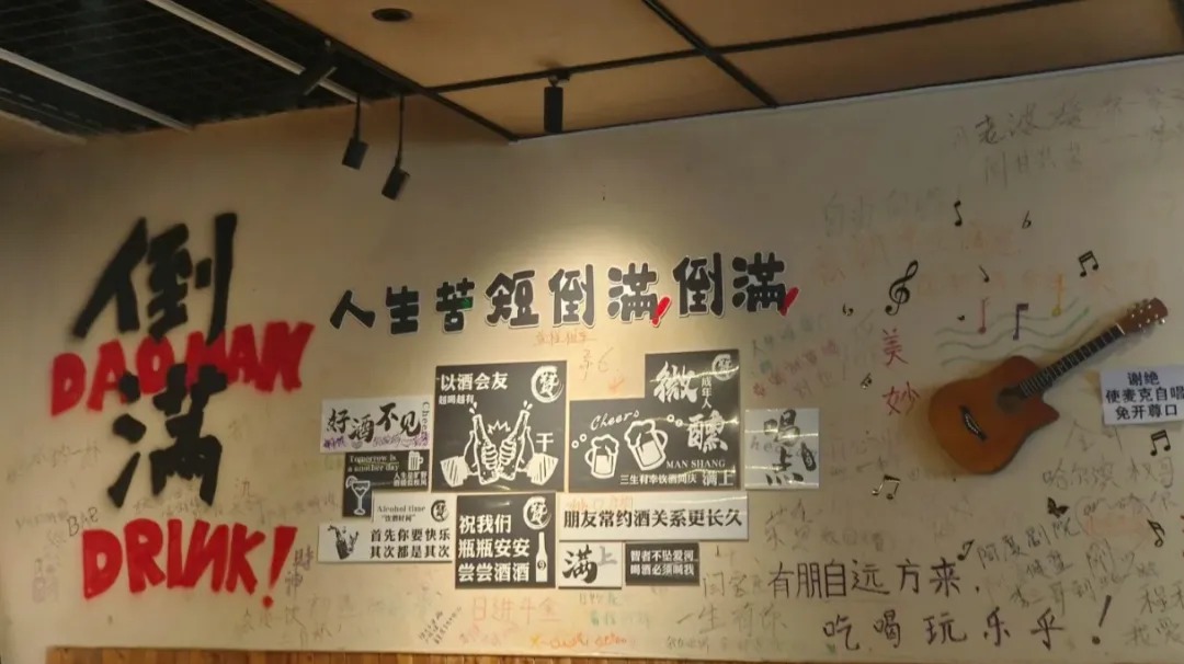 走进一家馄饨酒馆,昏黄的灯光、水泥地板、简陋的木桌,以及十块钱一只的塑料凳子,构成了几乎统一的空间风格。墙上挂满土味标语——“让喝酒的人先富起来”“你有故事我有酒”“人生苦短,把酒倒满”“祝您牛逼”。