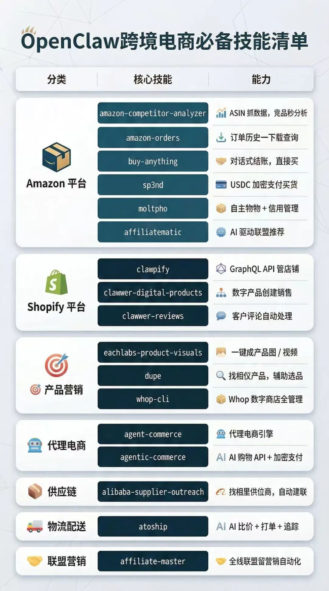 百度则选择了电商作为切入口。2月13日,百度优选官方电商Skill正式上架ClawHub,成为OpenClaw生态首个官方级电商能力插件。它将百度商品知识图谱与CPS供应链能力封装为标准化工具,开放CPS商品库检索、SPU跨平台比价、多商品参数对比与口碑总结等能力。这意味着,智能体从此可以一站式完成从找货到决策下单的全流程电商任务。