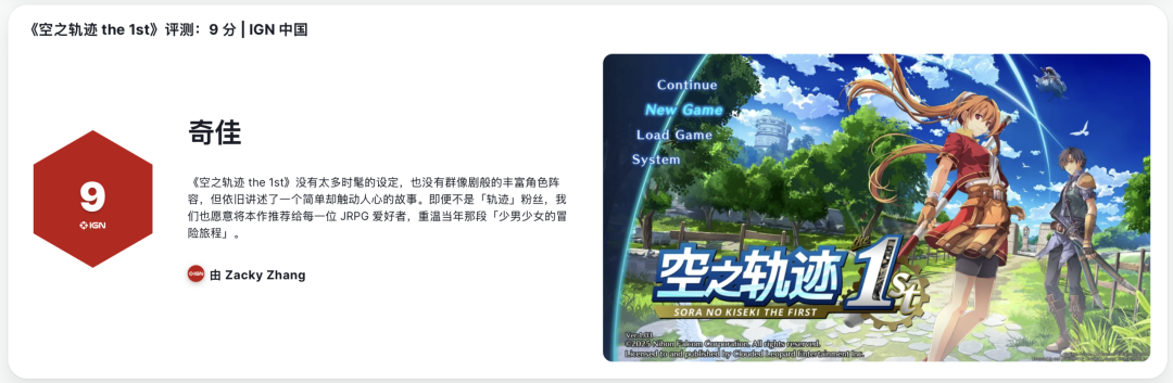 IGN中国《空之轨迹the 1st》开分高达9分