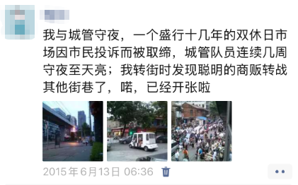 第一,其实在2010年前后,有一本叫《城管来了》的书很火,是一位北京城管队员写的,写得非常幽默。那时候“城管来了”一喊,摊贩赶紧收摊跑人,说明这些流动摊贩确实是违规经营的,城管部门的管控是很有杀伤力的。