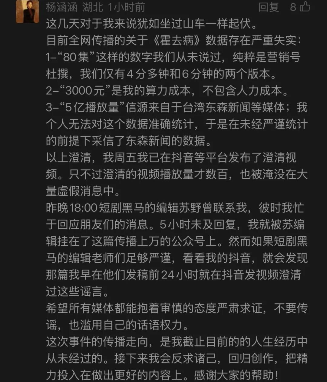 当然也有虚假叙事形成“噪音”。比如近期AI短片《霍去病》就遭不实信息刷屏:谣言说它80集、3人48小时完成、成本3000元、播放量5亿。创作者杨涵涵出面澄清:全片只有两个短片版本,3000元只是导演个人的算力成本,人工并不在内;而5亿播放量更是未经权威核证的数据。