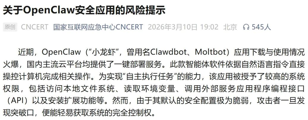 所以,目前国家互联网应急中心也发了“龙虾”的风险提示,说这玩意儿有“提示词注入”、“误操作”、“插件投毒”、“安全漏洞”四大风险,可能导致个人隐私泄露、核心数据被删,甚至让设备沦为黑客的“肉鸡”。