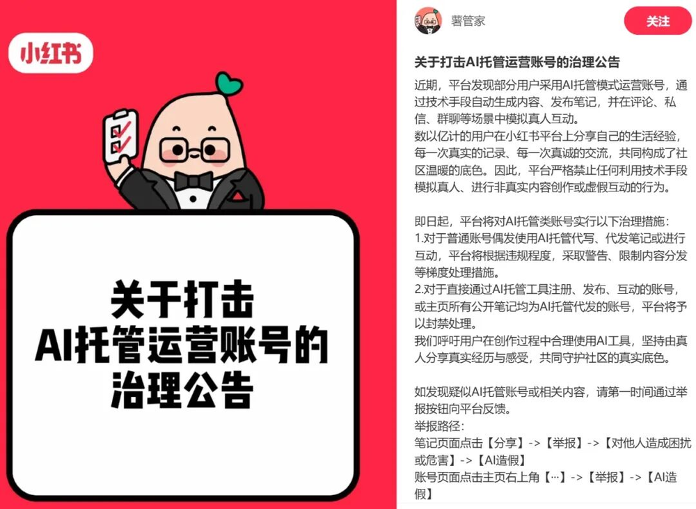 小红书在3月10日发了治理公告,宣布对纯AI托管运营的账号下手。
