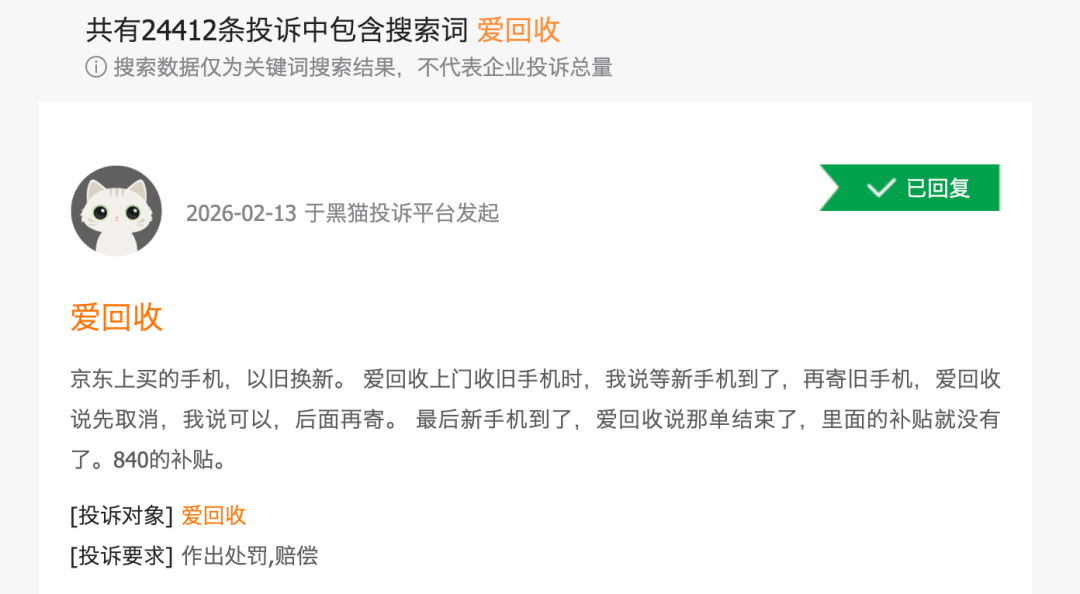 线下门店作为爱回收最重的资产,不仅是流量的入口,更是信任的背书。但在快速扩张的过程中,管理半径的拉大、人员培训的滞后,导致服务质量参差不齐。在黑猫投诉平台上,以“爱回收”为关键词的消费者投诉累计已接近2.5万条。这一数字本身,已成为悬挂在爱回收品牌形象上的一把达摩克利斯之剑。