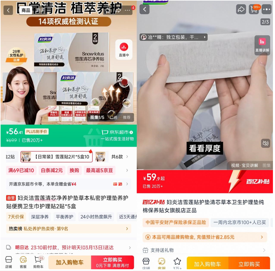 截至发稿前,在妇炎洁官方旗舰店相关产品仍在售。业内人士透露,此类雪莲贴利润率超1000%,商家精准抓住女性对妇科问题“羞于启齿”的心理,以“草本排毒”“调理保养”为噱头抬高身价。