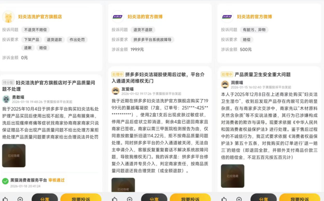 还有消费者亦表示:“购买的凝胶使用后出现了皮肤过敏症状,停用产品症状立即消退”“卫生湿巾存在肉眼可见的明显杂质,商家却以木材天然含杂质为由推诿扯皮”“私处护理产品有腥臭味,使用后出现瘙痒疼痛等症状“。