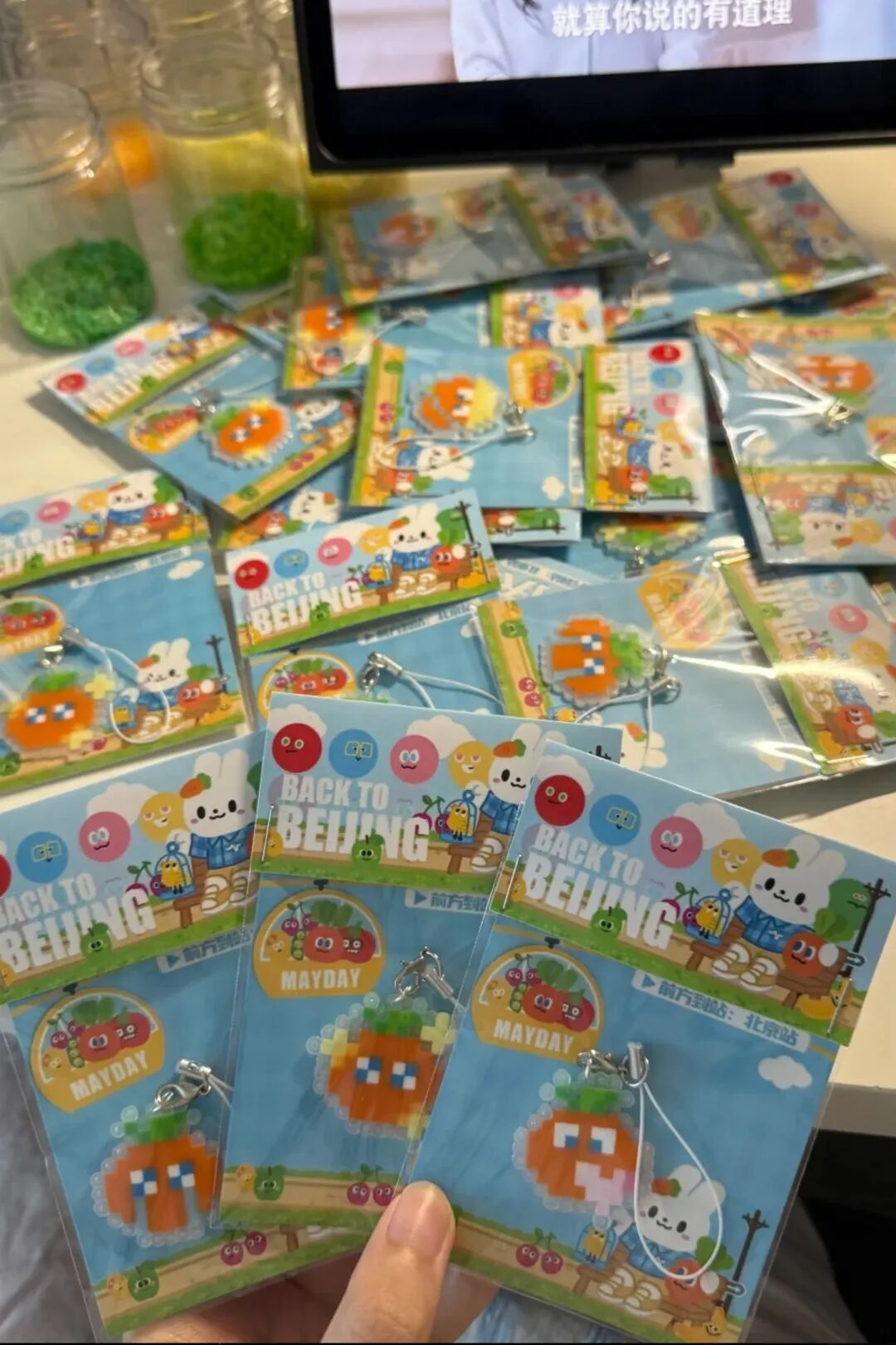 这些带有强烈个人喜好标签的成品最常见的是挂在包上,或是制作成“无料”(免费发放、交换的自制周边)送给同好,甚至衍生出用拼豆搭建场景、装饰周边的“谷美”玩法。