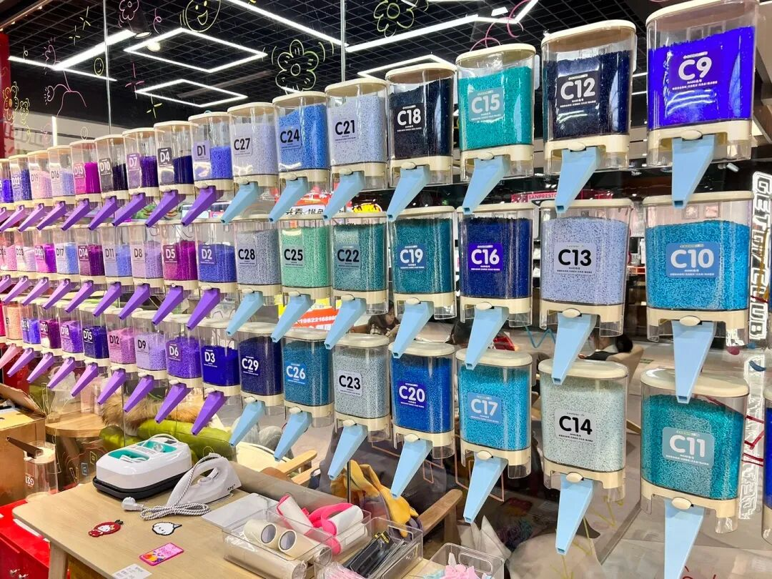 这类门店通常都进行了系统的设计,最抓眼球的就是一整面墙、挂满按颜色分类的“拼豆桶”,消费者可以拿着小盒去自助称豆,按重量买单。